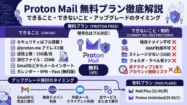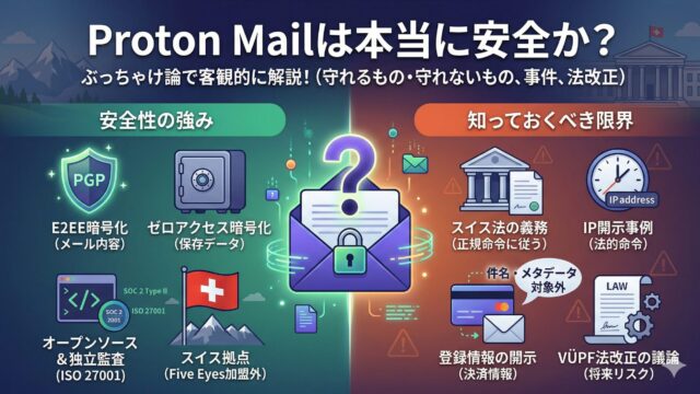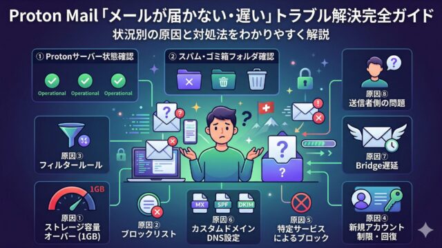 Proton Mailを使っていると、「送ったはずのメールが届いていない」「メールが届くのが遅い」という状況に遭遇することがあります。このような原因は複数あり、ケースによって対処法が異なります。この記事では、状況別に原因と対処法をわかりやす...