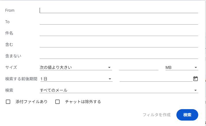 2. 詳細な検索オプションが表示されます。転送したいメールの条件を入力します。