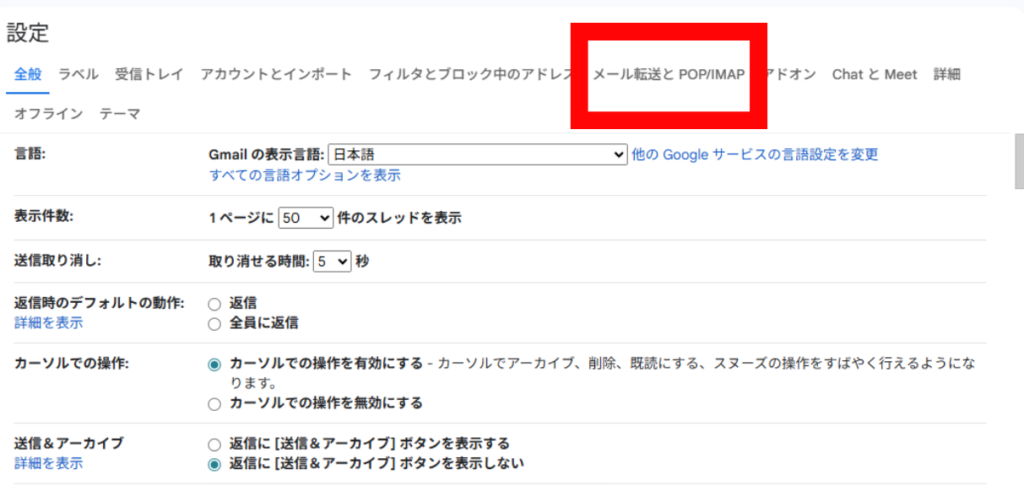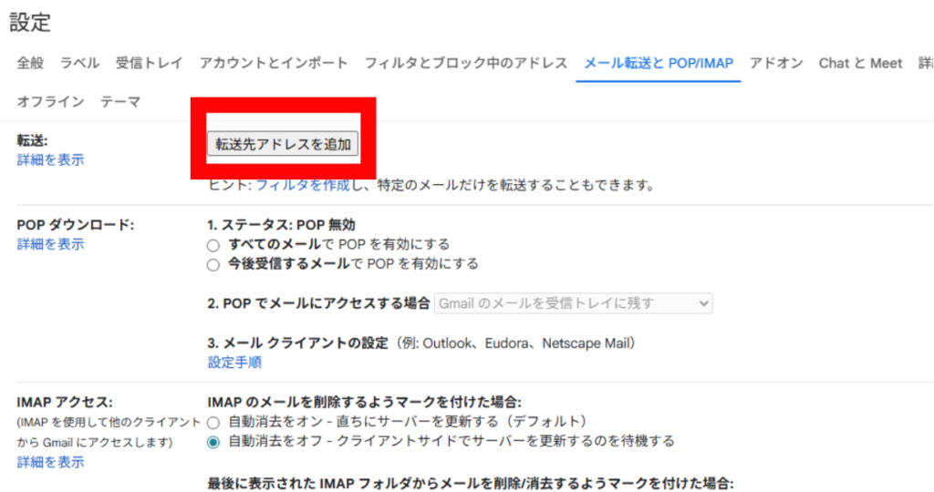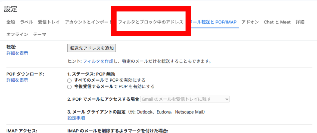 手順2:「メール転送とPOP/IMAP」タブを開く