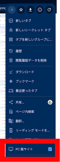 2. 右上の「⋮」をタップし、「PC版サイト」にチェックを入れます。