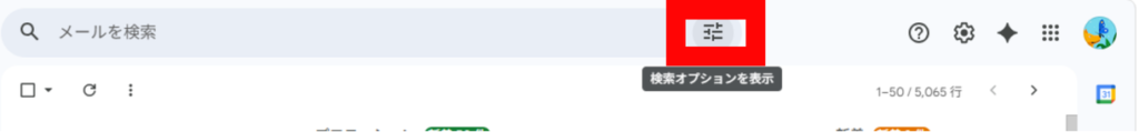 1. Gmailの受信トレイ画面で、検索バーの右側にある「▼(検索オプションを表示)」アイコンをクリックします。
