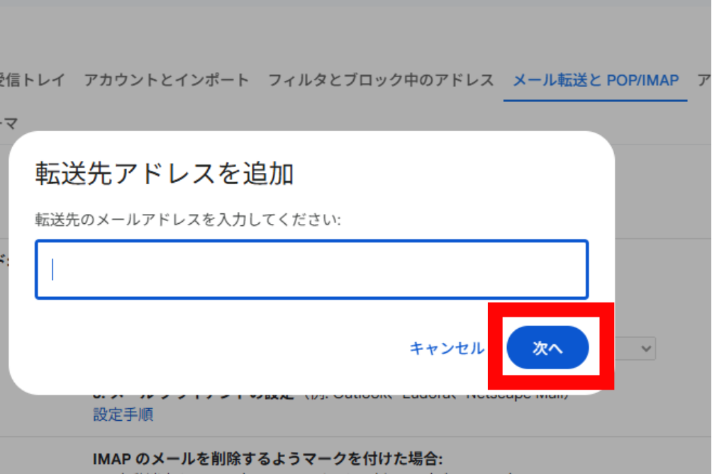 6. ポップアップが表示されます。転送先にしたいメールアドレスを入力して「次へ」をクリックします。