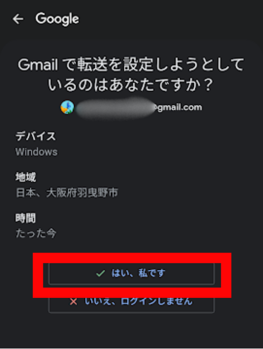 7. スマートフォンに確認の表示がされますので、「はい、私です」をタップします。