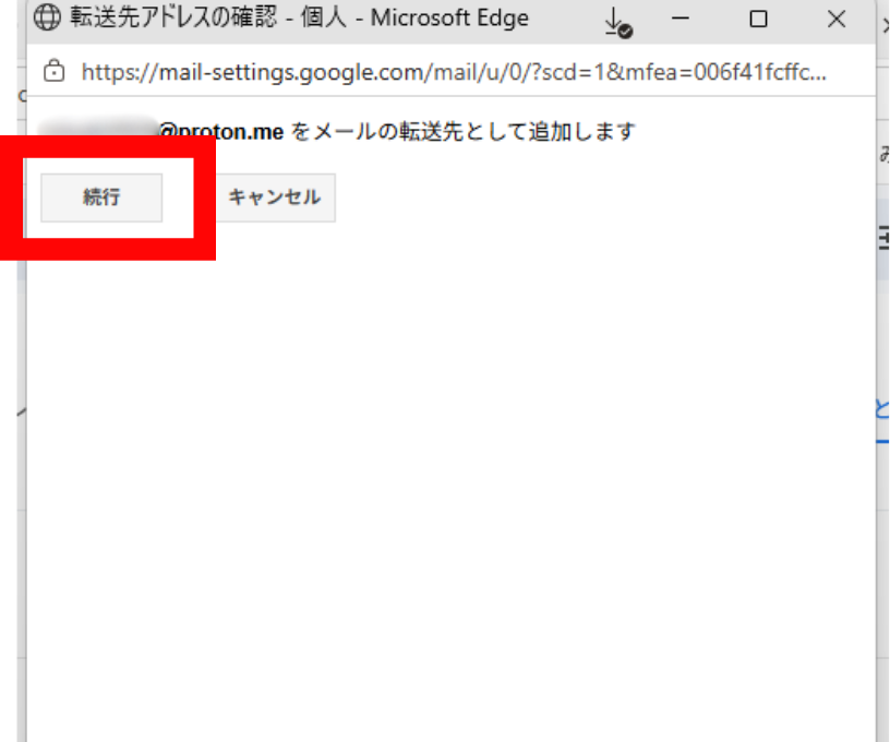8.入力したメールアドレスの確認画面が表示されます。アドレスが正しいことを確認して「続行」をクリックします。
