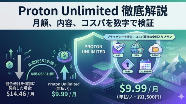 Proton Unlimited Proton Unlimitedは元が取れる?料金・内容・損益計算を徹底解説【2026年版】 Proton Unlimitedに加入しようか迷っている。月額はいくらか、何が含まれているのか、そして本当にコストパフォーマンスに見合うのか。この記事では、Proton Unlimitedのプラン内容を整理した上で、「別々に契約した場合と比... 2026.03.29 Proton Unlimited